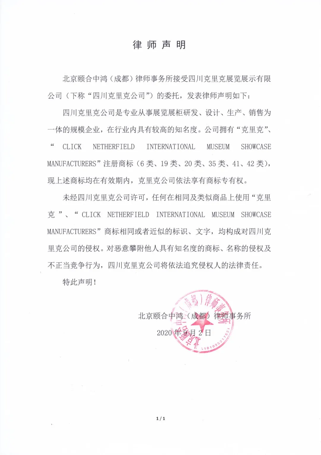 未經四川克里克公司許可,任何在相同及類似商品上使用“克里克”、“CLICK NETHERFIELD INTERNATIONAL MUSEUM SHOWCASE MANUFACTURERS”商標相同或者近似的標識、文字,均構成對四川克里克公司的侵權。對惡意攀附他人具有知名度的商標、名稱的侵權及不正當競爭行為,四川克里克公司將依法追究侵權人的法律責任。