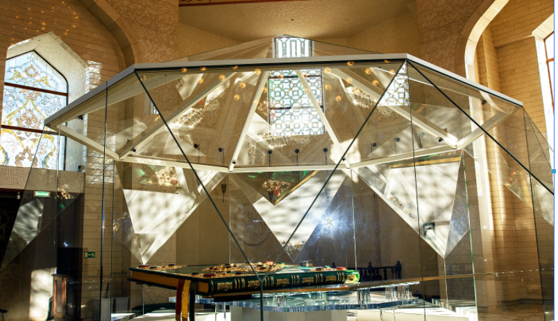 克里克設(shè)計并制作了一個獨特的水晶帳篷形狀的展示柜。該陳列柜于2018年3月安裝,以八字形狀的底座為基礎(chǔ)。底座被涂成白色,這是伊斯蘭文化中最受人喜愛的顏色,以展現(xiàn)一種純正和寧靜的感覺。頂部的金屬梁也是如此。展示墻安裝沒有支柱。整個建筑僅由玻璃墻支撐,充分展示了我們的精確設(shè)計和精湛的施工技巧。陳列柜主要由玻璃制成,整體形象類似于一個巨大的水晶帳篷,與博物館的頭盔狀圓頂完美呼應(yīng)。