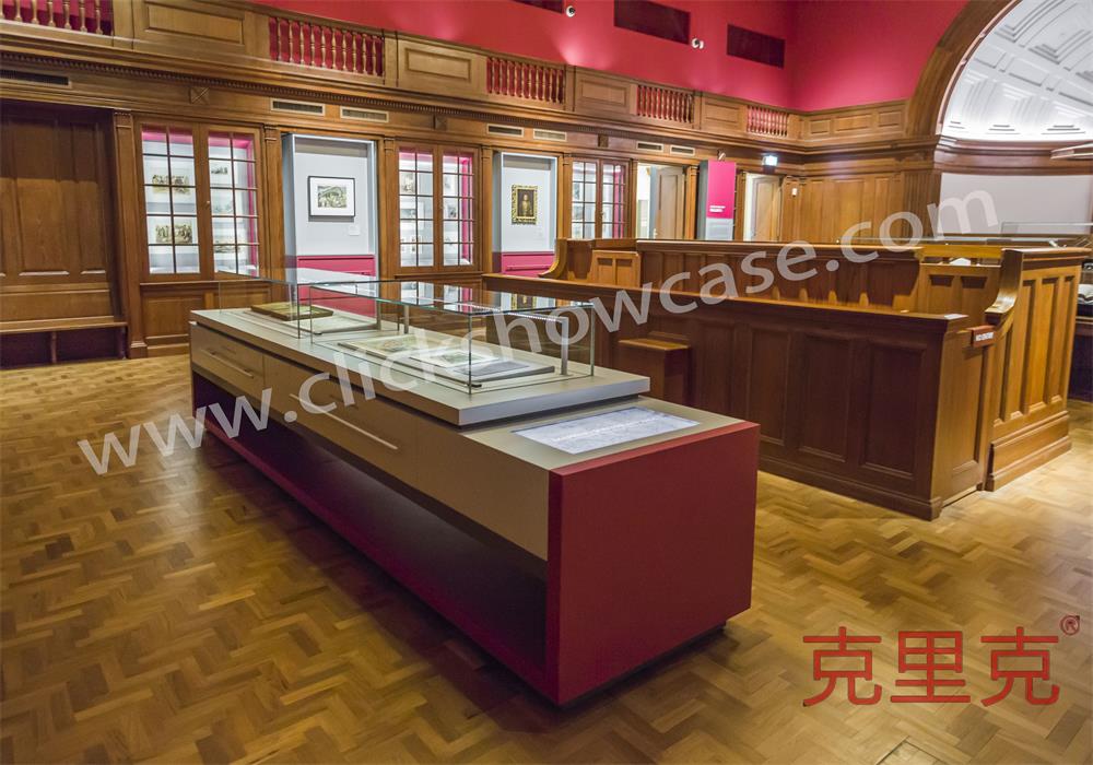 一件由四個獨立柜組成,長達近 5 米的特制展柜,使用了近 2.5 噸金屬,該組合展柜所有功能設備,包括光纖照明系統、半自動緩閉裝置、被動吸入式通風設施、電動開啟開關甚至一塊桌面觸控顯示屏幕都被巧妙的隱身在這個多層組合柜中。設計團隊甚至必須為用來放置展柜的桌子(具有歷史意義的桌子,同樣也是館藏文物)設計無接觸式的光纖照明系統。