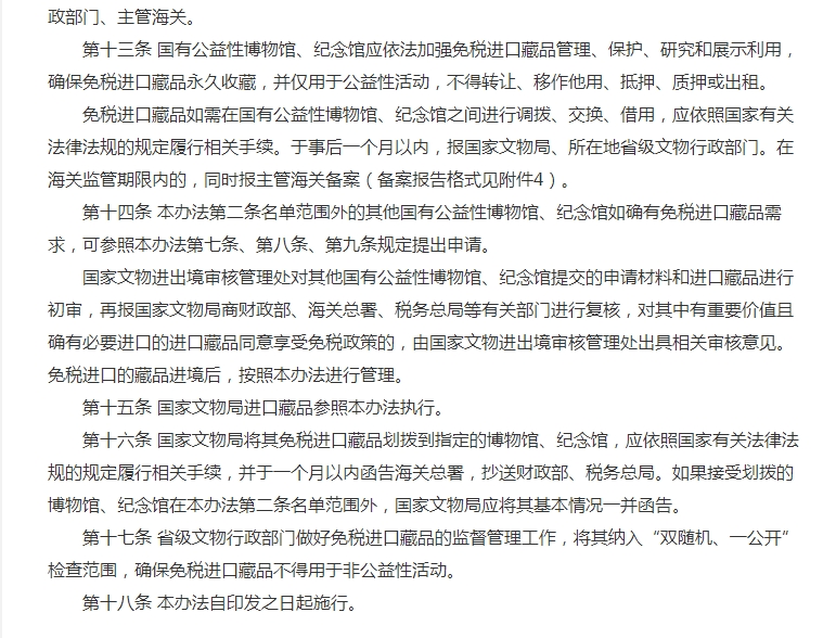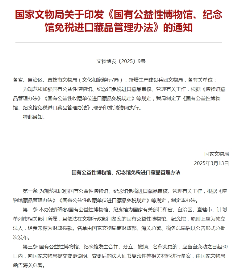 國(guó)家文物局印發(fā)《國(guó)有公益性博物館、紀(jì)念館免稅進(jìn)口藏品管理辦法》
